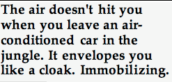 The air doesn’t hit you when you leave an air-conditioned car in the jungle. It envelopes you like a cloak. Immobilizing.